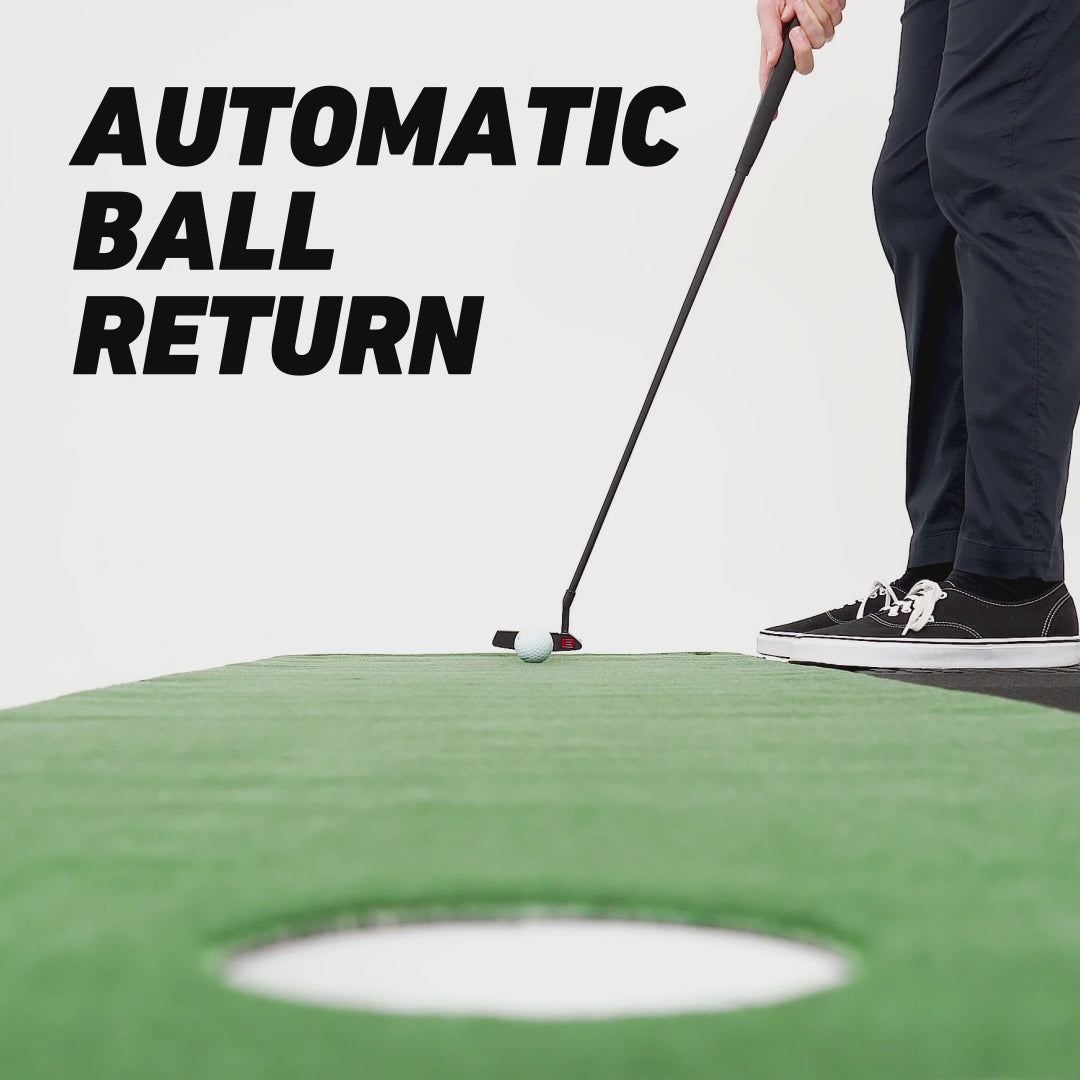 - Made putts are returned to your feet by a battery powered automatic ball returner.